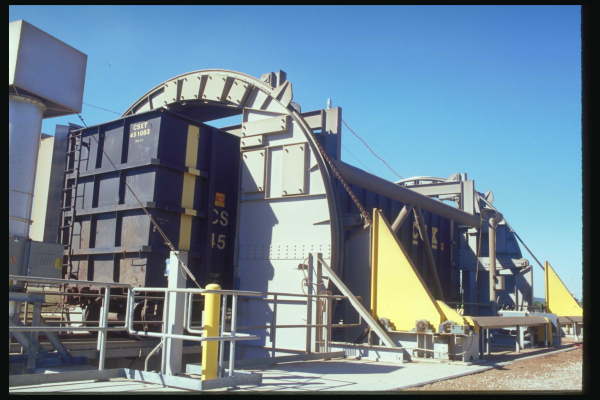 The expense involved in old high lift railcar dumpers led to the evolution of a side discharge machine that remains popular today. This Rotary Dumper, just as with its predecessor, required no modifications to existing railcars, and in turn led to a significant development in how railcars were utilized. A railcar's center of gravity is in the same plane as its coupler, so if railcars rotate about their own couplers, there is no need to uncouple the cars to dump them. This led to the development of the rotating coupler and the “unit train.”